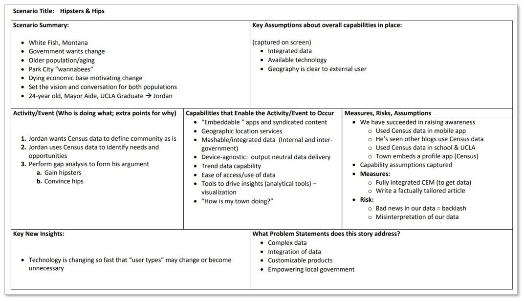 The key is getting the group to summarize their story in a structured template (below right) so that they have a record of what the scenario represents.
