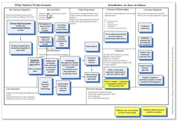 I customize the scenario summary template to the session goals. I have also used the Business Model Canvas (below left) — and tailored it for government use — from the Business Model Generation book.