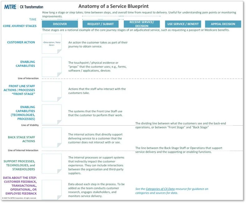 I created these templates to guide sponsors and mentor MITRE team members on the elements and use of Service Blueprints.